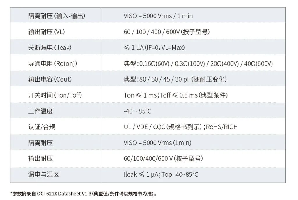 OCT621X 凭借高隔离、低漏电、低导通电阻、宽温稳定的组合优势,在 BMS 电压量测场景中,实现高压侧小信号的安全隔离与高频固态切换,让电芯、模组电压量测更精准、更安全,是车载 BMS 高压量测的优选器件。